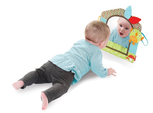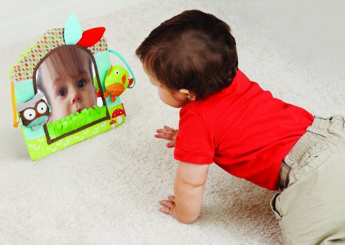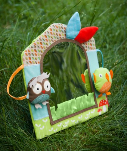 Baby will delight in discovery as she sees herself in this baby-safe FRIENDLY FOREST ACTIVITY MIRROR!Perfect for tummy time or anytime! An adorable wide-eyed owl and sweet birdie keep baby company as she learns selfrecognition and engages in tactile play! It stands upright or folds flat and loops on the back allow it to attach anywhere!It includes: Field of “grass ribbons” for soothing tactile play, tuggable crinkle leaves, pull and place owl rattle and birdie squeaker, stand upright with wedge or attach anywhere with loops on the back, playful pattern and linen details. Product Measures: 9″ x 5.25″ x 9.5″ Recommended Ages: 0 months & up